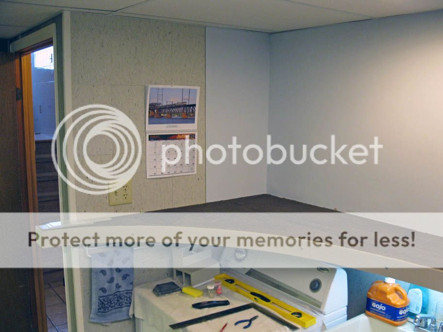 We laid the track near the foreground, including the warehouse tracks, switcher garage track and one leg of the runaround. The bridge is now connected to Donohue. By the way, I removed the central bridge pile. After disccussion, we found out it should be directly glued on the plywood and not on shims. This will be particularly crucial when pouring the river.
